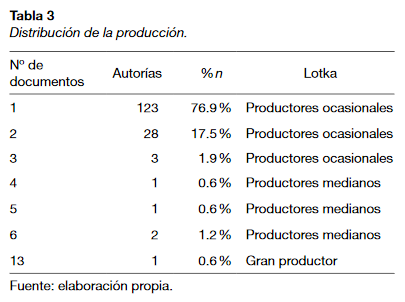 En cuanto al número de trabajos firmados por una misma autoría, utilizando para el análisis la ley de productividad científica de Lotka, destacaron los productores ocasionales (96 %), con uno, dos o tres textos por autoría, en menor proporción medianos productores (2.5 %) y tan solo un gran productor (0.6 %) que es Martin E. Block (Tabla 3).
