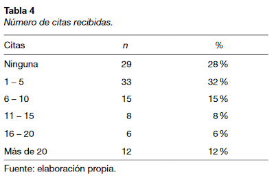 Por otra parte, en cuanto a la repercusión de los documentos analizados, medida por el número de citas recibidas (Tabla 4), se observa que casi un tercio de las publicaciones no tuvieron ninguna cita, otro tercio poseen entre una y cinco citas, y un 15 % tiene entre 6 y 10, lo que refleja la baja repercusión de la mayoría de trabajos, también explicada por lo reciente de muchas de estas publicaciones. Sin embargo, existen 12 artículos con más de 100 citas, como el de Morley et al. (2005), que aborda la cuestión de la inclusión del alumnado con NEE desde la perspectiva del profesorado de Secundaria.