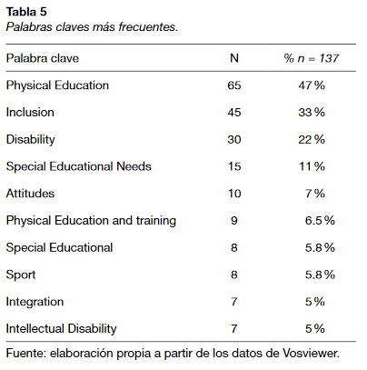 A continuación, se señalan las instituciones de educación superior con mayor número de producciones en el ámbito internacional, como la University of Virginia (Hodge et al., 2017) o Ohio State University (Haegele y Zhu, 2017). En el contexto español destacan la Universidad Miguel Hernández (Reina et al., 2019), la de Castilla la Mancha (Abellán et al., 2018), la de Santiago de Compostela (Varela et al., 2019), la Politécnica de Madrid (Ocete et al., 2017) o la Universidad de Valencia (Moya-Mata et al., 2017). Además, destacan revistas como Adapted Physical Activity Quarterly, Physical Education and Sport Pedagogy, la Revista Brasileira de Educação Especial . Sport, Education and Society.