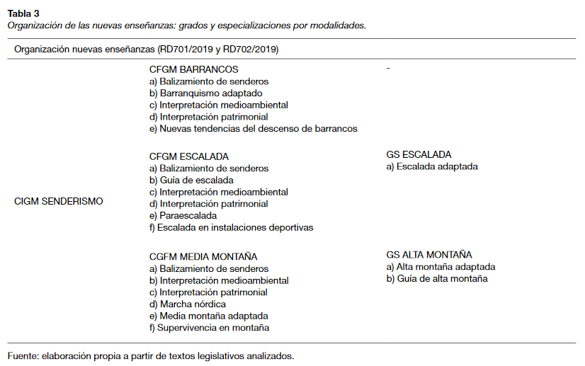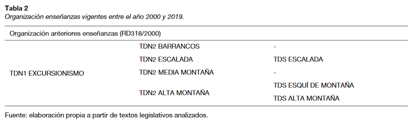 Las titulaciones de técnico/a deportivo/a y técnico/a deportivo/a superior (TD y TDS) fueron integradas al sistema educativo mediante la aplicación del Real decreto 1913/1997, posteriormente derogado por el Real decreto 1363/2007, y se denominaron enseñanzas deportivas de régimen especial (EDRE). Las titulaciones de TD y TDS de los deportes de montaña y escalada fueron establecidas por el Real decreto 318/2000 (RD 318/2000), el cual requería a las comunidades autónomas (CCAA) el desarrollo propio del currículo, obligando a respetar unas enseñanzas mínimas (EM). La implantación de dichas EDRE fue descrita como lenta, complicada, poco homogénea e insuficiente a la demanda, ya que se implementaron de manera distinta en las comunidades autónomas (CCAA) y en diferentes modelos de centros de enseñanza (Madrera et al., 2014). La oferta formativa en AFMN ya se describió, en 2005, como muy variada y se reportó cierta confusión por lo referido a las competencias para las que capacita cada formación (Sáez y Giménez, 2005). La vinculación entre las EDRE con el ámbito profesional y la ordenación de los espacios profesionales es muy estrecha (Madrera, et al., 2015) y, aunque se ha avanzado mucho desde los inicios, la titulación requerida para ejercer como técnico/a en las AFMN es un tema “que continúa en vías de resolución” (Inglés y Seguí, 2012a, p. 188). Además, estas actividades tienen un ciclo de creación constante y evolucionan uniéndose o mezclándose con otras, lo que provoca que la regulación quede obsoleta rápidamente (Mediavilla, 2014). En enero de 2020 se publican los reales decretos 701/2019 y 702/2019 (RD701/2019 y RD 702/2019, respectivamente) que proponen cambios sustanciales en la estructura, competencias y currículos de las formaciones técnicas de las especialidades de montaña y escalada, derogando el RD318/2000 y todas las disposiciones de igual o inferior rango que se opongan a la nueva norma (disp. derogatoria única de los RD701/2019 y RD702/2019). Se deberán implantar los nuevos currículos de estas enseñanzas a partir del curso escolar 2021/2022 (RD567/2020 que modifica RD701/2019 y RD702/2019) y las administraciones educativas de las CCAA deberán establecer los currículos correspondientes (art. 15, RD701/2019; art. 28, RD702/2019). Hasta dicha implantación de nuevos currículos, siguen ejecutándose las enseñanzas del RD318/2000 y las establecidas en los desarrollos normativos de las CCAA.