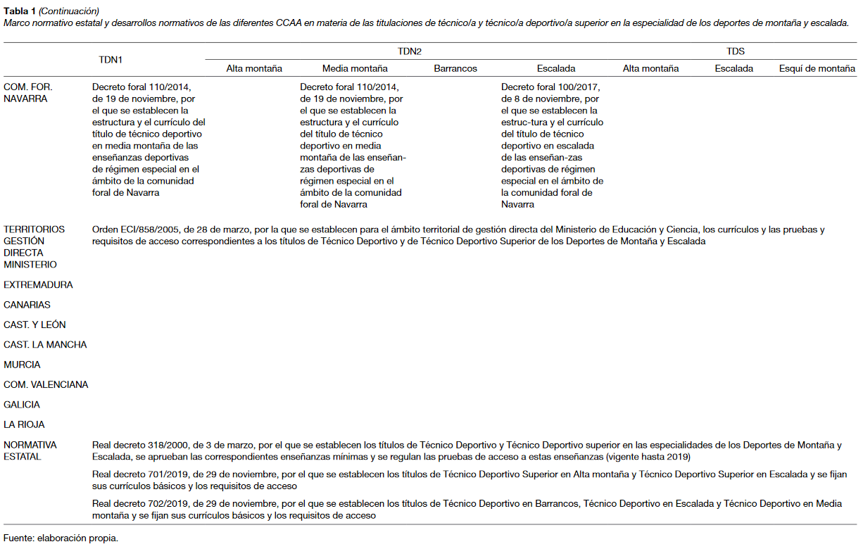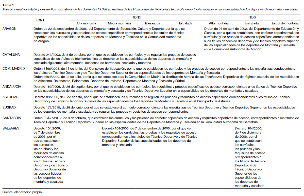 El contexto expuesto justifica la pretensión del presente artículo de analizar y comparar la normativa estatal con el desarrollo normativo de CCAA en las titulaciones de TD y TDS en la especialidad de los deportes de montaña y escalada, mediante el análisis de los anteriores y nuevos currículos establecidos.