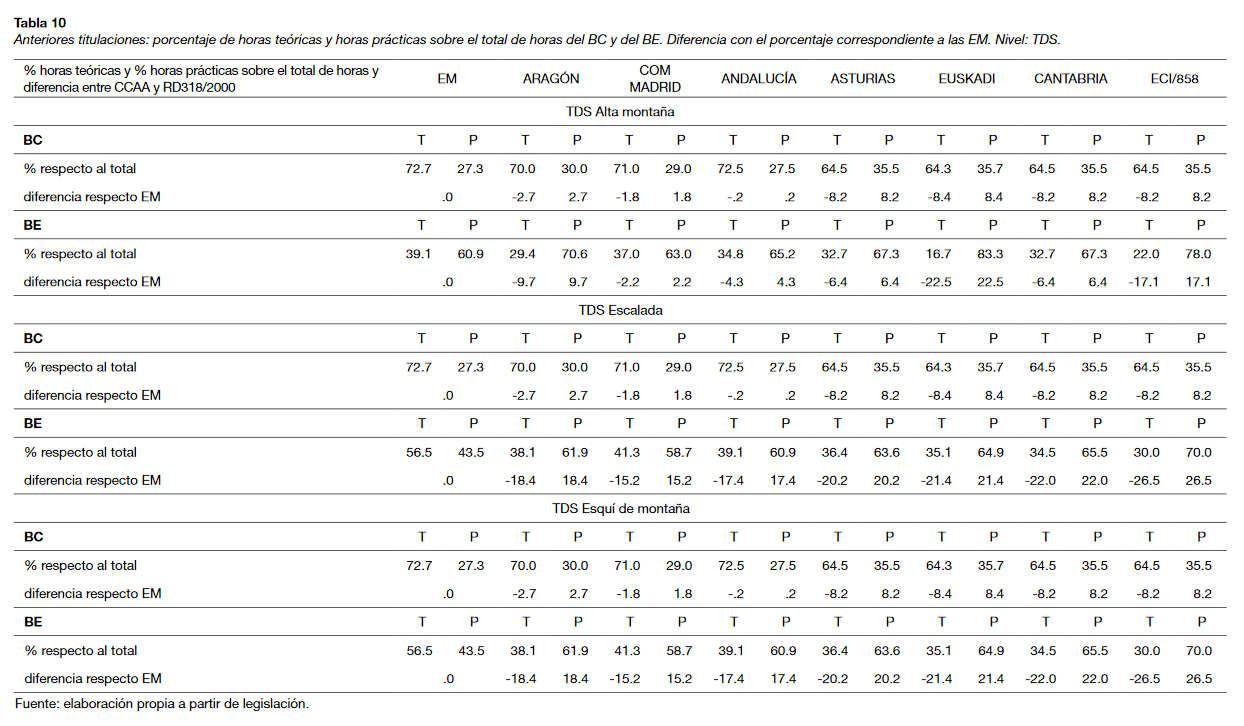 En las anteriores titulaciones (RD318/2000), quedaba determinada una proporción de horas teóricas y prácticas. Las CCAA, en sus desarrollos normativos, establecieron la distribución de teóricas y prácticas a su parecer. En las tablas 9 y 10 aparece el porcentaje de horas teóricas y prácticas sobre el total de horas del BC y BE y la diferencia entre este y el porcentaje correspondiente establecido en las EM. De su análisis se pudo destacar que la gran mayoría de las CCAA, en el BC y el BE de todos los niveles formativos, presentaron más proporción de horas prácticas en comparación con la proporción establecida en las EM.