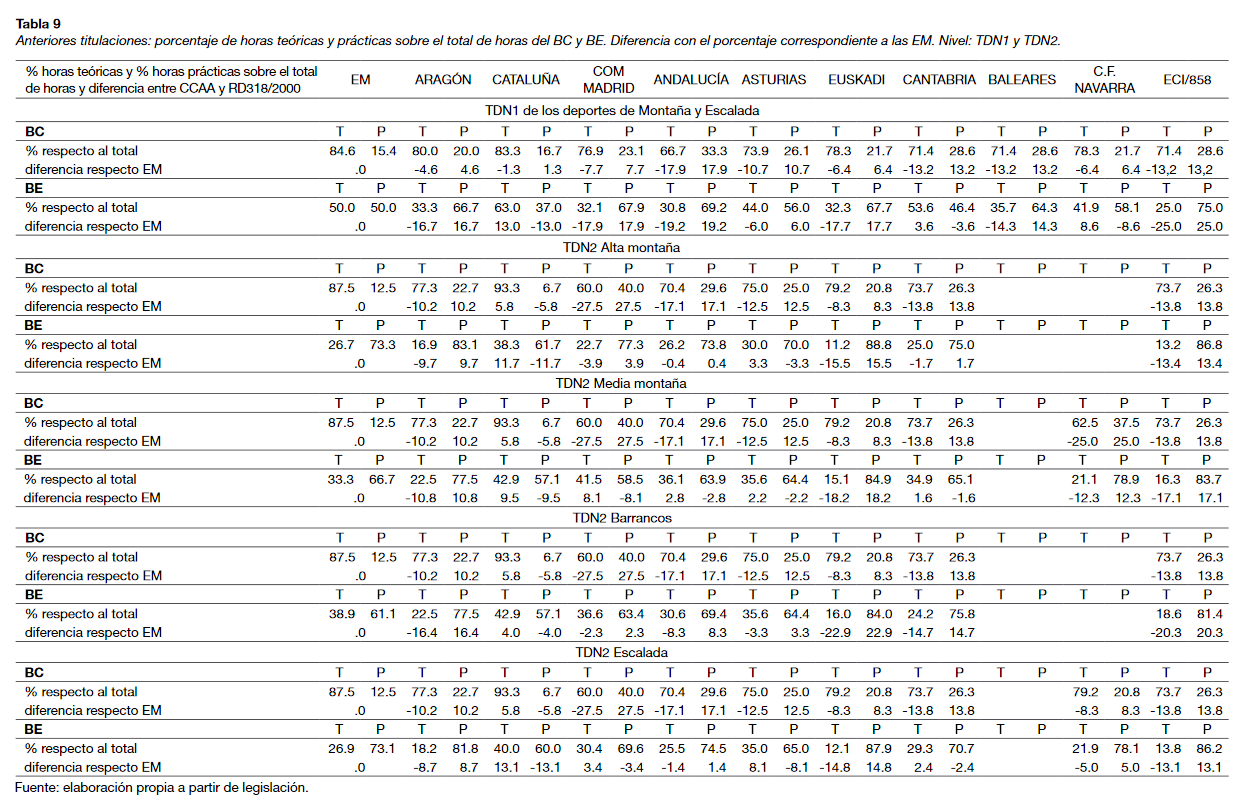 En las titulaciones vigentes hasta 2019 se reportó heterogeneidad entre CCAA y en comparación con la norma estatal en TDN1 y TDN2 por lo que se refiere a la identificación de las titulaciones, unidades de competencia, capacidades profesionales y perfil profesional. Aunque sí existió un consenso mayoritario en la ubicación en el ámbito deportivo, solo algunas CCAA contemplaron y concretaron el ejercicio en el tiempo libre, ocio y/o turismo activo, lo que pudo generar problemas en el ejercicio profesional a un lado y otro del límite autonómico, en la movilidad entre CCAA y llegar a dificultar la comparación entre países. Las titulaciones ahora vigentes establecen una denominación, una estructura clarificadora del perfil profesional, competencias y entorno profesional, solucionando vacíos e incongruencias de la anterior norma (se contemplan las vías ferratas, se clarifica competencia en ocio, turismo y tiempo libre, sobre los técnicos/as que pueden guiar baja y media montaña estival, entre otras). La nueva normativa ha establecido especializaciones, aunque queda por resolver su estructura. Una consecuencia destacable de las equivalencias entre anteriores y nuevas titulaciones es que se crean diferencias de competencias entre técnicos de un mismo nivel.