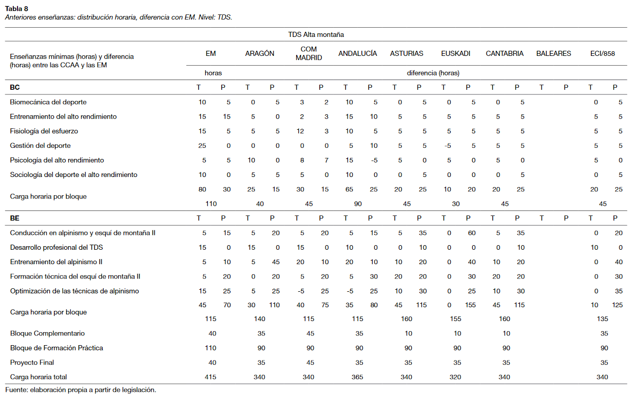 Por un lado, se observó que en determinadas CCAA se cursaban módulos no propuestos en la norma estatal: Cataluña fue la única que impartió “Didáctica y dinámica de grupos”, “Psicología de los deportes de montaña y escalada”, “Equipamiento de instalaciones de escalada” y “Formación técnica y metodología de la enseñanza de la escalada” (no aparecen en el RD318/2000). Andalucía destacó por no cursar “Formación técnica y metodología de la enseñanza del esquí de montaña” y por ser la única en cursar “Formación técnica de la progresión en montaña”. Existen módulos que reciben distinta denominación de una CCAA a otra como, por ejemplo, “Seguridad y gestión del riesgo” en Aragón (denominada “Seguridad de la modalidad deportiva” en la norma estatal) y “Conocimiento del medio” en Cataluña (denominación que sustituye a “Medio ambiente de barrancos”).