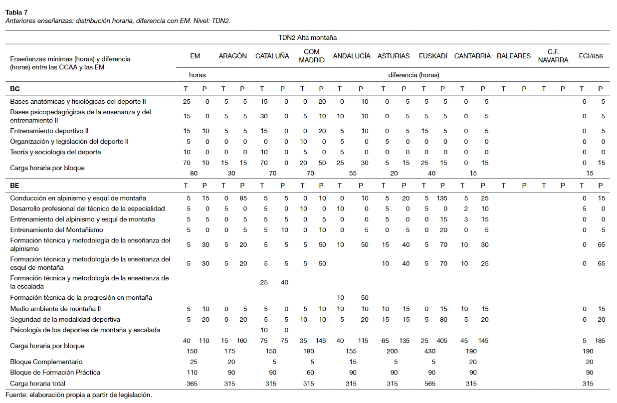 Por ejemplo, Cataluña añadió competencias de TDN2 alta montaña que no aparecían en la norma estatal referidas a informar al grupo sobre itinerario previsto con el uso de mapas, sobre naturaleza y cultura, material adecuado y mantenimiento, entre otras. Fue la única CCAA que especificó para el TDN2 media montaña la posibilidad de ejercer en alta montaña en verano (Anexo 6, 3; Decreto 243/2003), competencia no contemplada por el RD318/2000. Destacó la incongruencia en la tipología de barranco donde podía ejercer el TDN2; únicamente Andalucía y Aragón consideraron el ejercicio en barrancos horizontales y secos, y Cataluña consideraba el ejercicio también en terrenos de baja, media montaña y terrenos no especificados. La nueva legislación clarifica este punto explicitando competencia en barrancos secos y acuáticos.