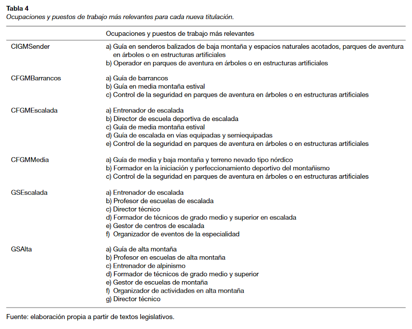 En las anteriores titulaciones no se detallaron las principales ocupaciones que se podían desarrollar; únicamente Cataluña lo hizo. La nueva legislación sí establece los puestos de trabajo más relevantes para cada titulación (Tabla 4).