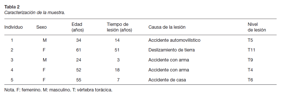 La muestra del estudio consistió en cinco personas con un nivel de LME entre T4 y T11 y un tiempo promedio de lesión de 18.6 años, de ambos sexos (Tabla 2). Las cinco personas no tenían limitaciones motoras en sus extremidades superiores para realizar AVD.