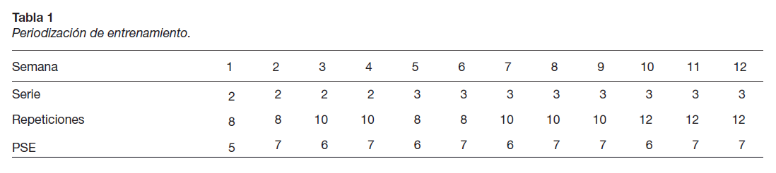La planificación de la periodización siguió el siguiente cronograma: dos series de 8 repeticiones en la primera semana, aumentando a dos series de 10 repeticiones en la segunda semana y a tres series de 12 repeticiones en las semanas siguientes, e intervalos de 60 segundos entre series en las primeras dos semanas, disminuyendo a 30 segundos en las semanas siguientes (Tabla 1). Todos los participantes realizaron los mismos ejercicios.