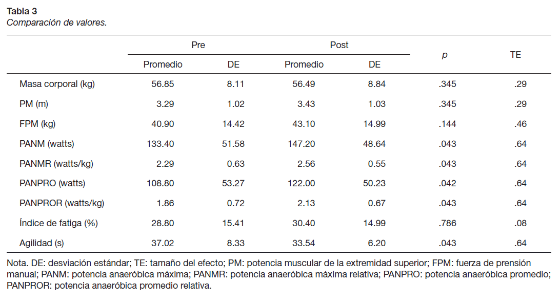 La Tabla 3 presenta los resultados con respecto a la evaluación de la fuerza muscular subdividida en PAN; potencia muscular y fuerza de prensión manual, así como la funcionalidad representada por la prueba de agilidad. El entrenamiento funcional fue capaz de aumentar la PAN. Además, la funcionalidad de los participantes tomaron parte en el entrenamiento funcional fue mayor tras 12 semanas de entrenamiento, lo que se comprueba por la reducción del tiempo en la prueba de agilidad.