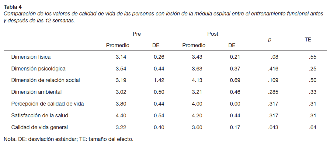 En base a los resultados de este estudio, fue posible concluir que 12 semanas de entrenamiento funcional fueron suficientes para producir mejoras en la PAN y la agilidad, con los consiguientes efectos directos sobre la mejora de la capacidad funcional de cinco personas con LME traumática, entre T4 y T11, de ambos sexos, sin paraparesia u otras limitaciones motoras en sus extremidades superiores. Además, el programa de entrenamiento aplicado colaboró a promover mejoras en la CV general, así como a mejorar las dimensiones físicas y las relaciones sociales de las personas participantes. Los resultados encontrados respaldan el uso del entrenamiento funcional como una estrategia a tener en cuenta al aumentar la capacidad funcional y la CV de las personas con LME que presenten condiciones motoras y de salud similares a la muestra estudiada en este trabajo.