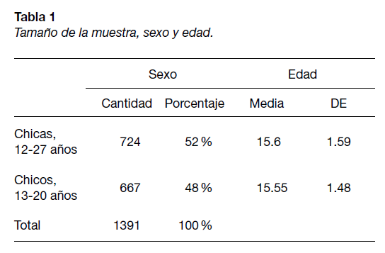 La muestra se determinó de forma aleatoria entre los centros en los que el profesorado aceptó participar en el estudio durante el período 2017 y 2018. El tamaño de la muestra se eligió con los mismos criterios que se utiliza en la encuesta FRESC (Factores de riesgo en estudiantes de secundaria de Barcelona) para adolescentes de Agencia de Salud Pública de Barcelona (ASPB), es decir, precisión del 3 %; error a 5 %, una proporción estimada del 50 % (p = q = .5) y una no respuesta del 20 %. Con estos parámetros el tamaño de la muestra calculada fue de 1391 adolescentes, 667 chicos y 724 chicas.