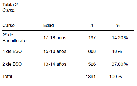 El objetivo del estudio no fue la comparación entre cursos ni por centros, por ello la muestra se escogió de forma global teniendo presente que no todos los que terminan 4º pasan a bachillerato, pero a pesar de ello, en función del tamaño muestral los resultados fueron representativos de todos los estudiantes del entorno del equipo de investigadores.