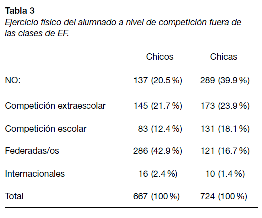 En la cuenta de la AF del alumnado se han excluido las horas de dedicación a las clases de EF. Los chicos realizaron significativamente (p < .001) más competiciones federadas que las chicas y estas realizaban más competición escolar y extraescolar. A partir de los 17 años disminuyó significativamente el número de alumnos federados (p < .001) (Tablas 3 y 4).