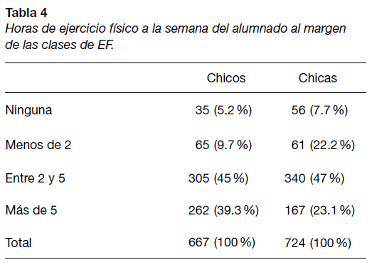 La mayoría del alumnado del estudio realizaba ejercicio físico entre 2 y 5 horas a la semana, inferior a las recomendaciones de la Sociedad Americana de Pediatría que considera que el grupo de edad entre los 6 y 17 años debería realizar al menos una hora al día de actividad moderada y si esta es intensa al menos 3 días a la semana. El 26.1 % de los adolescentes americanos no realiza ejercicio físico y un 15.4 % son sedentarios (Lobelo et al., 2020). Los niveles más bajos de práctica se observan entre las adolescentes y grupos con necesidades especiales. Un dato relevante es que la inactividad física aumenta con la edad. En el conjunto de alumnado que se estudió el 39.3 % de los chicos y el 23.1 % de las chicas cumplían con las recomendaciones de dedicar al ejercicio físico al menos una hora al día.