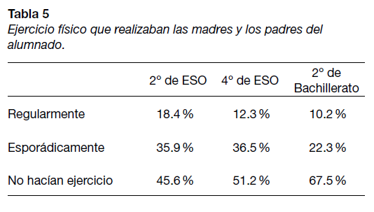 Es relevante la información sobre el ejercicio físico que realizaban los padres, puesto que de su ejemplo y motivación se beneficiarán los adolescentes, lo que conlleva una educación con un estilo de vida saludable.