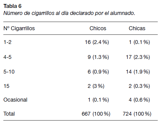Diferentes estudios realizados en adolescentes para conocer la prevalencia de fumadores en España indican que se ha producido un descenso en el consumo de tabaco. Se mostró una horquilla que oscilaba entre el 8.5 % y 13.3 % en chicos y entre 12.7 % y 16.4 % entre las chicas. Estos resultados correspondían a los años entre 1993 y 2008 (Villalbí et al., 2012). En el grupo de adolescentes que se valoraron el 93.4 % de los chicos y el 90.1 % de las chicas no eran fumadores, porcentajes inferiores que confirmarían los datos del estudio de referencia en que se señala la tendencia a disminuir el consumo de tabaco.