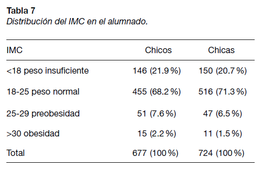 Obesidad. El IMC era inferior a 18 en 296 (21.3 %) de los casos y superior a 30 en 26 (1.9 %). Por encima de 25 había un total de 97 de los 1254 alumnos. Por encima de 30 y 26 (1.9 %), tenían sobrepeso/obesidad. No se observaron diferencias significativas entre chicas y chicos.