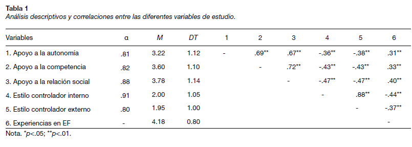 Los estadísticos descriptivos (M y DT), los coeficientes a de Cronbach y las correlaciones bivariadas de todas las variables del estudio se representan en la Tabla 1. De forma general, el alumnado percibió puntuaciones medias más altas en el apoyo a la autonomía, apoyo a la competencia y, especialmente, en el apoyo a la relación social, que en el estilo controlador interno y externo del profesorado de EF. Además, el apoyo a la autonomía, a la competencia y, especialmente, a la relación social correlacionaron significativa y positivamente con las experiencias del alumnado en las clases de EF, mientras que el estilo controlador externo y, especialmente, el estilo controlador interno lo hicieron de forma negativa.