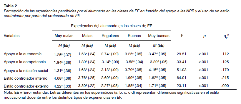 En relación con el segundo objetivo del estudio, como se observa en la Tabla 2, los ANOVA realizados entre las diferentes experiencias reportadas por el alumnado de EF (“muy malas”, “malas”, “regulares”, “buenas” y “muy buenas”) y el estilo motivacional percibido por el alumnado del profesorado de EF (apoyo a la autonomía, apoyo a la competencia, apoyo a la relación social, estilo controlador interno y estilo controlador externo), fueron significativos (p < .001) y mostraron tamaños del efecto que oscilaban entre moderados y altos. Los estudiantes que tuvieron experiencias “muy malas” y “malas” en EF mostraron valores significativamente inferiores en el apoyo a las tres NPB, así como valores significativamente superiores en el estilo controlador interno y externo, en comparación con el resto de los estudiantes, que tuvieron experiencias “muy buenas, “buenas” o “regulares”. En el polo opuesto, aquellos estudiantes que reportaron experiencias “muy buenas” percibieron valores significativamente superiores de apoyo a las tres NPB y valores significativamente inferiores de estilo controlador interno y externo, en comparación con los estudiantes que tuvieron experiencias “buenas”, “regulares”, “malas” y “muy malas”. Además, los estudiantes que reportaron experiencias “buenas”, se diferenciaron significativamente de aquellos estudiantes con experiencias “regulares” mostrando valores más altos de apoyo a las tres NPB y valores más bajos de estilo controlador interno y externo.