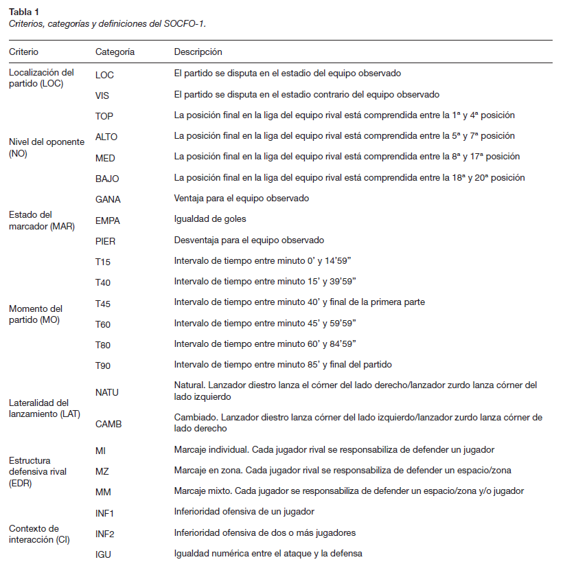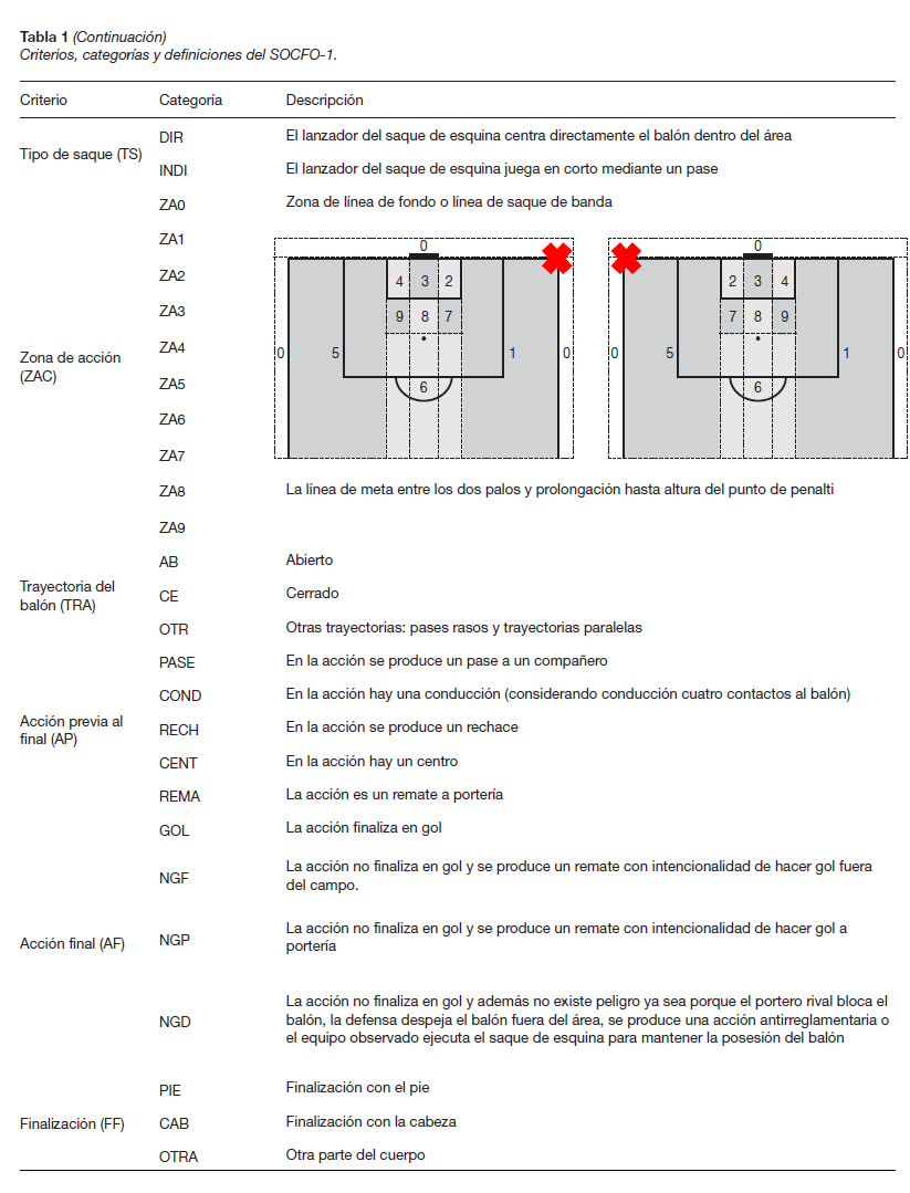 El instrumento de observación ad hoc construido para esta investigación se denominó Sistema de observación del córner en la fase ofensiva (SOCFO-1), adaptado del Sistema de observación en la fase de la estrategia ofensiva (SOFEO-1) (Fernández-Hermógenes et al., 2017). Fue validado a partir de un panel de 11 expertos, especialistas de alto rendimiento de fútbol y entrenadores de alta competición con licencia UEFA “A”, y compuesto por las dimensiones situacionales-contextuales y conductual que se desarrollan en 11 criterios y 47 categorías (Tabla 1) que cumplen las condiciones de exhaustividad y mutua exclusividad (E/ME). En la Tabla 1 se puede ver que las 10 categorías del criterio zona de acción (ZAC) se dividen entre las que corresponden al saque desde la banda izquierda y los que son lanzados desde la banda derecha.