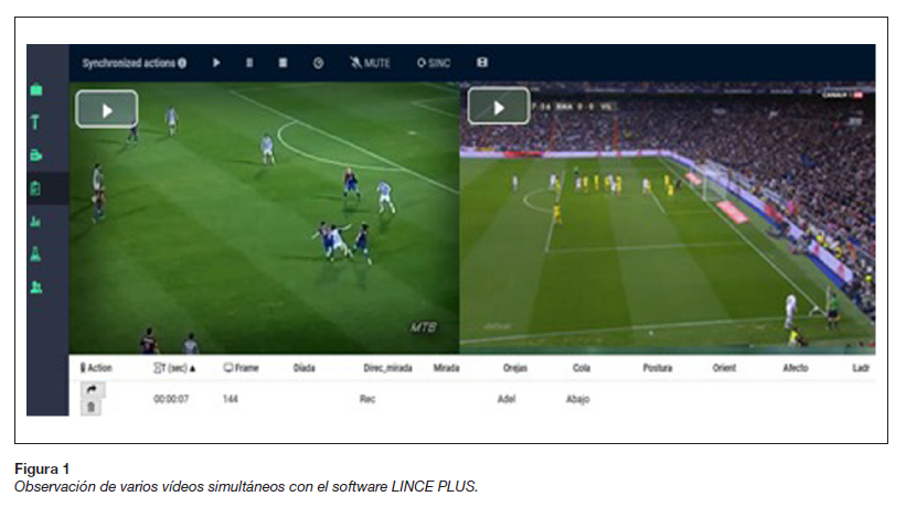 El registro codificado se realizó mediante el software libre LINCE PLUS (Soto et. al., 2019), que permitió introducir de forma integrada y sincrónica en la pantalla del ordenador: a) los diferentes criterios y categorías del instrumento de observación (SOCFO-1), b) las imágenes grabadas de los partidos, y c) el resultado de la codificación de los observadores (Figura 1). Las secuencias registradas se iniciaron con el lanzamiento del saque de esquina y finalizaron a los 10 segundos con la transformación de un gol o la recuperación o pérdida de la posesión del balón, al considerar que superado este tiempo se iniciaba el comportamiento táctico del equipo, que no es la pretensión de este estudio.