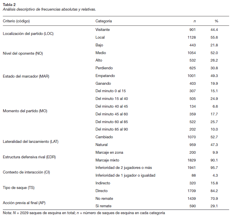 Los resultados de la distribución de los 2029 saques de esquina demuestran que se lanzan más saques de esquina jugando como local que como visitante, contra equipos de la mitad de la tabla, empatando y concretamente al final del partido entre el minuto 60 y 85 de partido. A nivel de posicionamiento aparece que siempre hay más jugadores defensas que atacantes en el área y la estrategia defensiva es combinada (individual y en zona). El porcentaje del lanzamiento entre pierna natural y cambiada es muy similar (47.3% vs 52.7%) y se producen en lanzamientos abiertos o cerrados directos a zona de remate reduciendo el número de acciones intermedias y zonas de intervención, aunque la tendencia en el saque de esquina es de no rematar 1439 (70.9%) y solo rematando 590 veces (29.1%).
