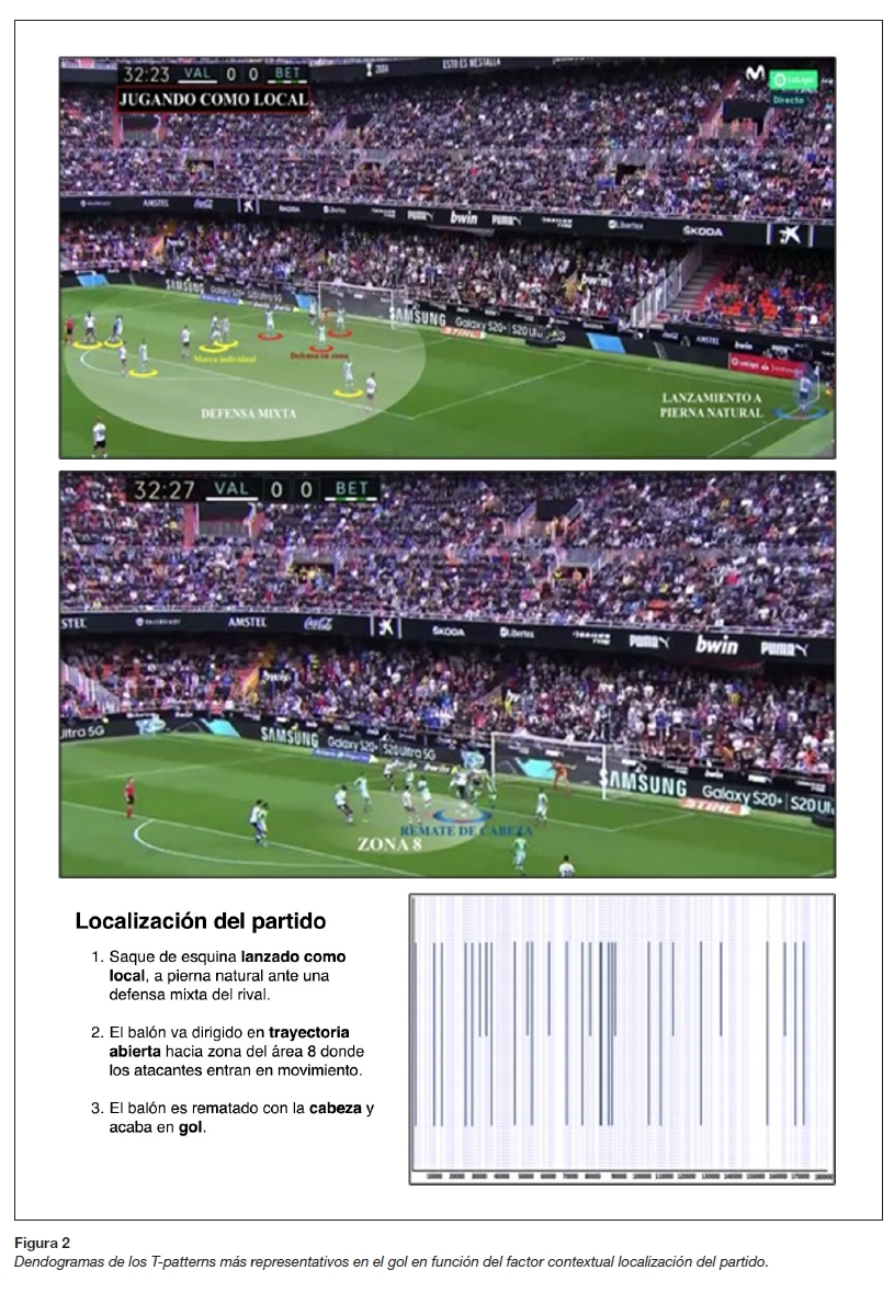 Teniendo en cuenta el factor de la localización del partido en el análisis de T-patterns (fig. 2), se ha obtenido que se producen más cantidad de lanzamientos de saque de esquina jugando como local. Estos resultados coinciden con los obtenidos en el análisis descriptivo de este estudio; no obstante, Ardá et al. (2014) contradice estos resultados argumentando que los lanzamientos como visitante son mayores en una muestra diferente.