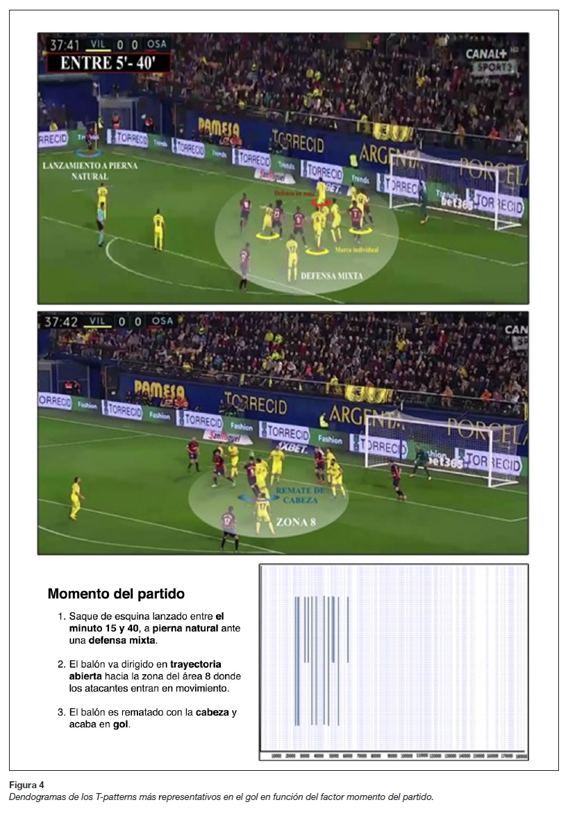 Por otro lado, los patrones temporales indican que la configuración más utilizada respecto a los criterios conductuales más efectivos en la consecución del gol es: lanzamientos a pierna natural, con trayectoria abierta del balón a zona de remate del punto de penalti y rematando de cabeza. También se puede encontrar otra configuración importante en la dinámica del juego a partir del lanzamiento a pierna cambiada con trayectoria cerrada del balón a zona de remate a la altura del primer palo y rematando de cabeza, lo que permite simplificar al jugador el saque de esquina y buscar esta calidad con orientación al remate.