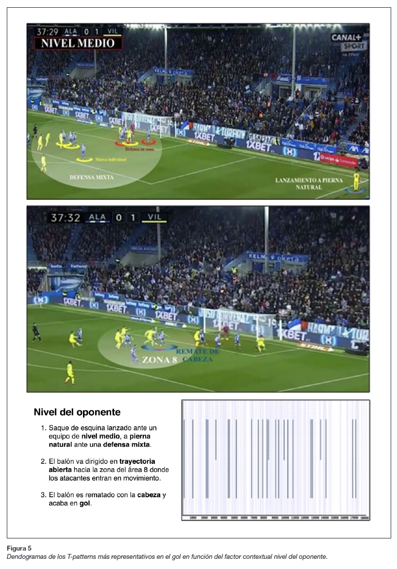 Para finalizar esta discusión del grado de eficacia de los patrones temporales del saque de esquina relacionando los criterios contextuales y los conductuales, se observa que existe escasez de estudios teniendo en cuenta el nivel del oponente. En los resultados de T-patterns (fig. 5) según el nivel del oponente, el saque de esquina es más efectivo ante equipos de nivel medio, seguido de los de nivel bajo. En el trabajo realizado por Fernández-Hermógenes et al. (2017), la diferenciación del oponente fue a partir de la categoría de primera y segunda división, siendo más efectiva la segunda división lanzando menos acciones a balón parado, pero marcando más goles. Estos resultados son totalmente contrarios a los obtenidos en nuestra investigación, puesto que a pesar de que en primera división hubo menos saques de esquina, se marcaron más goles.