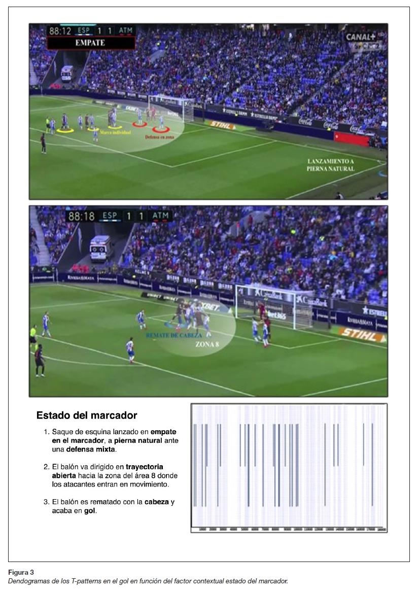 La variación en el resultado del partido viene condicionada por el factor estado del marcador en el análisis de T-patterns (fig. 3). En esta investigación se han obtenido datos semejantes a otros estudios que afirman que, en las situaciones de desventaja en el marcador, la obtención de un gol en ABP resulta decisivo para igualar el resultado (Lago et al., 2009). Consecuentemente y según Maneiro (2014) y Maneiro et al. (2016) el grado de eficacia del córner, con el marcador en empate o resultado adverso, confirmando los resultados obtenidos por Fernández-Hermógenes et al. (2017) y expresado con esta afirmación:
