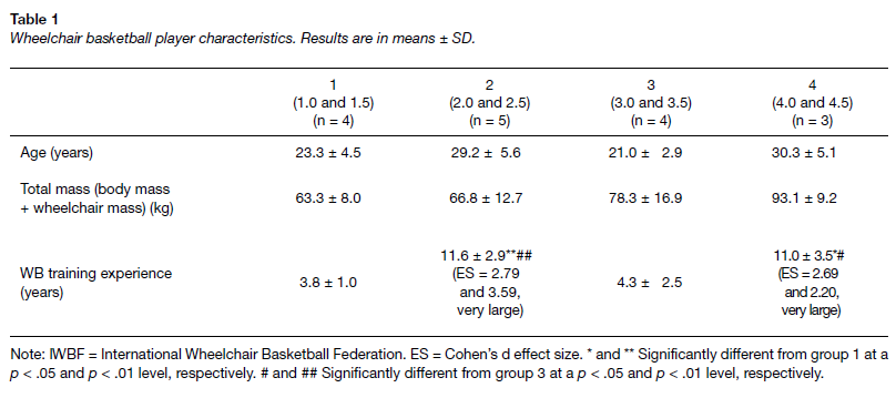 Contrary to previous reports in 5-m sprint measures, where no association was found between sprint performance and functional IWBF classification (Molik et al., 2013), in this study, significant strong correlations were found between SDSP and the functional IWBF classification individual score. Previous findings in WB men players (Gil et al., 2015; Yanci et al., 2015) indicate that sprinting abilities were more influenced by WB (or wheelchair) experience rather than by the functional classification. However, we did not find any statistical association between SDSP and WB training experience. Thus, our correlational results reinforce the notion that while training status and technical experience were likely to contribute to SDSP (especially because of the very large significant differences in WB training experience between groups 1 and 4), functionality seemed to play a more important role, confirming that the functional classification groups of women wheelchair basketball players is an accurate representation of their level of functional ability (Vanlandewijck et al., 2004).