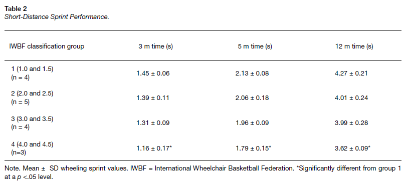 In conclusion, a clear trend in which the higher the functional IWBF classification the higher the SDSP was obtained in elite WB women. The SDSP test (split times at 3, 5 and 12 m) would therefore appear to be sufficiently sensitive to reflect the level of functional ability in elite WB women players.