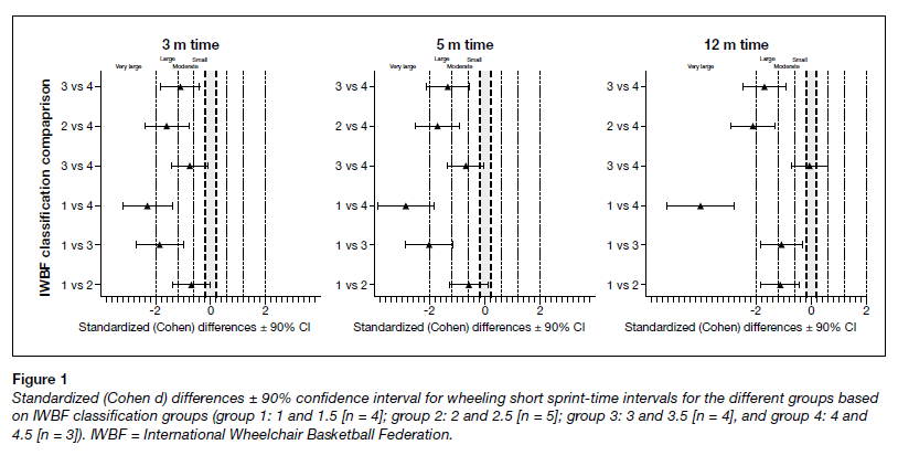 Abstract: The aim of this study was to analyse the short-distance sprint performance (SDSP)differences between functional International Wheelchair Basketball Federation (IWBF)classes in elite wheelchair basketball (WB) women players. Additionally, the associationbetween WB experience and the IWBF functional classification score and SDSP wasassessed. Sixteen WB women players belonging to the Spanish national WB teamwere grouped according to the functional IWBF classes: group 1 (class 1 and 1.5),group 2 (class 2 and 2.5), group 3 (class 3 and 3.5) and group 4 (class 4 and 4.5). Eachparticipant completed 2 sets of 12-m wheeling sprints at maximum speed, and splittimes at 3, 5 and 12 m were recorded. Major significant differences were observed inSDSP between groups 1 and 4 (p <.05; effect size [ES] range: -2.27 – 4.02) and, whilenot significant, a clear trend in which the higher the functional IWBF classification thehigher the SDSP was observed. Moreover, we found a significant strong associationbetween the functional IWBF classification individual score and the SDSP (p < .05; rsrange: 0.61 – 0.71). The SDSP test (split times at 3, 5 and 12 m) would therefore seemto be sufficiently sensitive to reflect the level of functional ability in elite WB women.