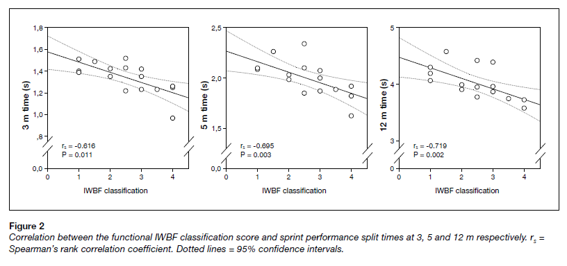 While training experience did not show any correlation with sprint performance, the functional IWBF classification score was strongly (Spearman’s rank correlation coefficient range: .61 – .71) and significantly (p < .05) correlated with split times used to assess wheeling sprint performance (Figure 2).