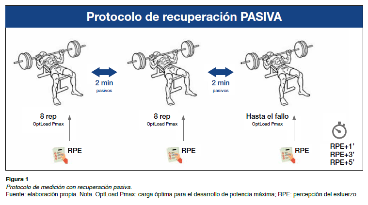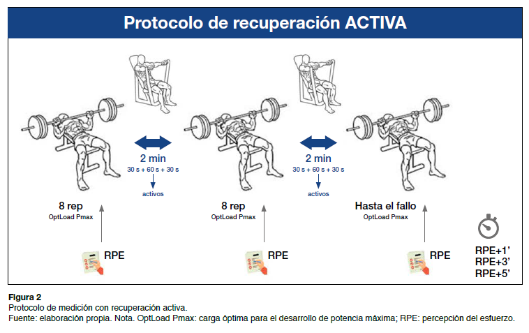 A los siete y a los 14 días, aproximadamente, después de haber realizado la primera visita al laboratorio los voluntarios acudieron para participar en las dos intervenciones que llevaríamos a cabo y poder comparar las diferencias entre la recuperación activa y la pasiva. En orden aleatorio los participantes realizaron uno de los dos protocolos siguientes, tras la realización de un calentamiento general y específico igual al realizado el primer día. En el protocolo de recuperación pasiva (PAS), realizaron dos series de ocho repeticiones a la máxima velocidad de ejecución posible con la carga óptima calculada para el desarrollo de la Pmáx (OptLoad Pmax) y una 3ª serie hasta el fallo muscular, separando las series entre sí con una recuperación pasiva de dos minutos (Figura 1). En el protocolo de recuperación activa (ACT), los participantes realizaron dos series de ocho repeticiones a la máxima velocidad de ejecución posible con la OptLoad Pmax y una 3ª serie hasta el fallo muscular, separando las series entre sí con una recuperación activa de dos minutos en press vertical de pecho con el 5-10% de la 1RM y a una velocidad de ejecución de dos segundos la fase concéntrica y dos segundos la excéntrica, controlada con un metrónomo (Metronome Beats 5.0.1) (Figura 2).