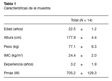 Todos los datos de la muestra presentaron una distribución normal en cuanto a la edad, la altura, el peso, el índice de masa corporal (IMC), la experiencia en entrenamiento de fuerza y la Pmáx (Tabla 1).