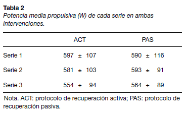 Todos los datos se analizaron utilizando el software estadístico SPSS 20 (SPSS Inc., Chicago, IL, USA). La normalidad de cada variable fue contrastada con la prueba de Shapiro-Wilk. Se realizó una prueba t de medidas repetidas para analizar los cambios asociados a cada protocolo (ACT vs. PAS) en las variables dependientes: potencia media propulsiva de la serie (MPP), índice de pérdida de potencia media propulsiva intraserie (%Perd) y percepción del esfuerzo (RPE). La significancia estadística fue configurada con un p-value ≤ .05, con un intervalo de confianza del 95%.