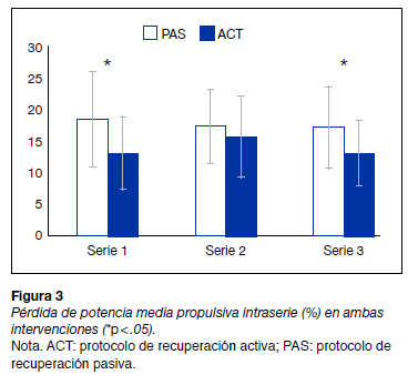 La pérdida de MPP intraserie (%Perd) fue más baja en ACT con respecto a PAS en las tres series (13,34% vs. 18,84%, 15,97% vs. 17,67% y 13,38% vs. 17,53%; respectivamente), siendo estas diferencias estadísticamente significativas para la 1ª y la 3ª serie (p= .006 y p= .001, respectivamente; p= .084 para la 2ª serie) (Figura 3).