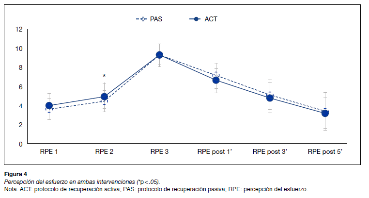 El RPE fue prácticamente el mismo en ambos protocolos, aunque el resultado de la 2ª serie fue significativamente más alto en ACT con respecto a PAS (4,5 vs. 5,0, p= .033). Asimismo, durante la recuperación tras ambos protocolos, el RPE tendió a ser ligeramente más bajo en ACT con respecto a PAS durante los registros post 1, 3 y 5 minutos (9,2 vs. 9,3, 4,8 vs. 5,1 y 3,2 vs. 3,4; respectivamente), aunque dichas diferencias no fueron estadísticamente significativas (Figura 4).