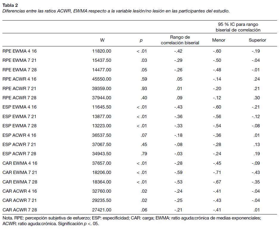 Atendiendo a la no normalidad de la muestra, el test prueba Mann-Whitney permitió determinar diferencias significativas (p < .05) respecto a la variable lesión o no lesión para las ratios CAR ACWR y para RPE EWMA (4:16, 7:28, 7:21), ESP EWMA (4:16, 7:28, 7:21), CAR EWMA (4:16, 7:28, 7:21) y (4:16, 7:28) (Tabla 2), con una magnitud del efecto entre -.586 y -.262. No se encontraron diferencias significativas entre las diferentes posiciones analizadas.