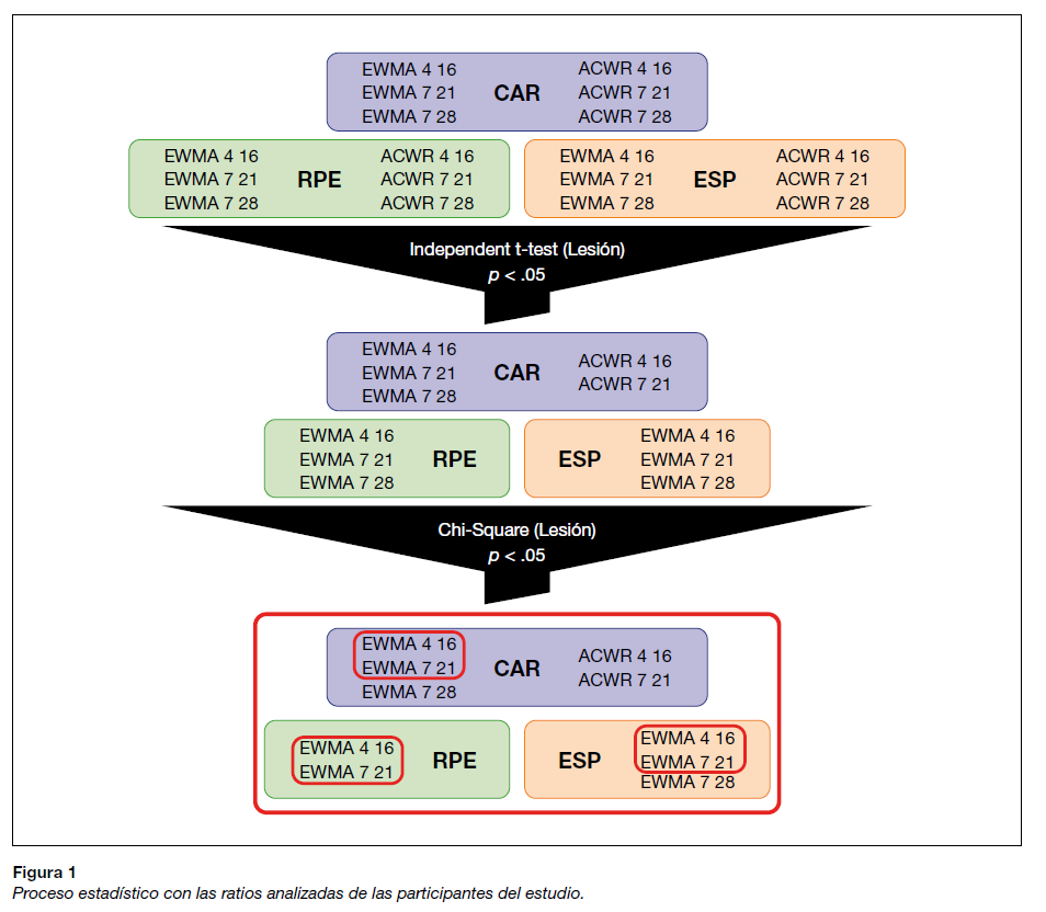 Después de un análisis descriptivo de la tendencia central, se determinó la normalidad de la muestra. Seguidamente, mediante la utilización de la prueba Mann-Whitney, se observaron las posibles diferencias significativas existentes entre las diferentes ratios analizadas y la variable lesión o no lesión. Posteriormente, se agruparon los valores de las ratios obtenidas para determinar el posible nivel de asociación con las lesiones, atendiendo a la naturaleza cualitativa de las variables, mediante el test chi-cuadrado. Todos los datos de significación se consideraron a partir de p < .05 (Figura 1). El programa que se utilizó para llevar a cabo el análisis estadístico fue JASP (The JASP Team, Ámsterdam, Holanda) en su versión 11.1 para Mac.
