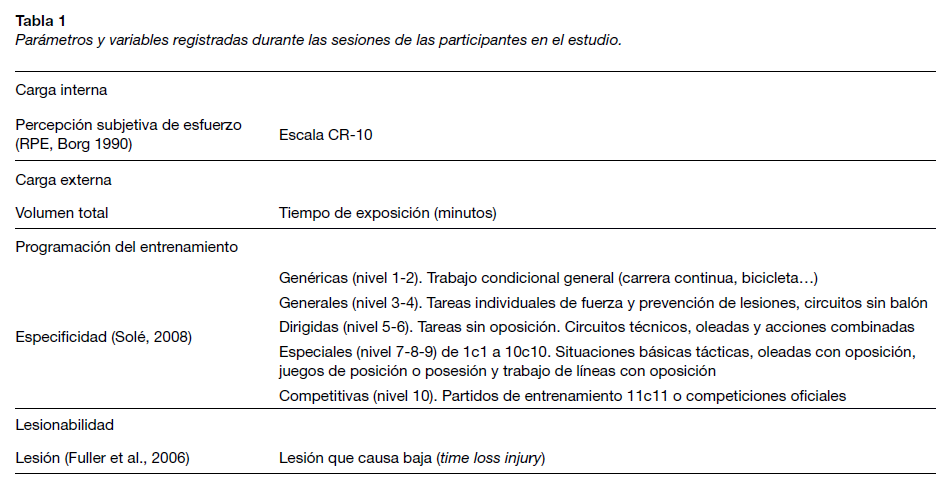 Las variables independientes registradas en este estudio correspondieron a RPE para CI, ESP (Solé, 2008) y el tiempo de exposición en relación con el entrenamiento y la competición para la CE. En relación con las variables dependientes, las lesiones que impedían la participación en entrenamientos y partidos (concepto inglés time loss injuries; Fuller et al., 2006) fse relacionaron con la lesionabilidad y a las diferentes ratios de relación de carga aguda:crónica.