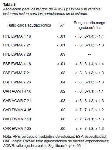 Posteriormente, se agruparon los valores de las diferentes ratios en diferentes rangos, con una diferencia superior a 1. El test chi-cuadrado mostró asociaciones de todas las ratios anteriores con las lesiones (p < .05) en CAR ACWR y en RPE EWMA (4:16, 7:28, 7:21), ESP EWMA (4:16, 7:21), CAR EWMA (4:16, 7:28, 7:21) y (4:16, 7:28), pero no para ESP EWMA 7 28. En relación al valor de los rangos de las ratios obtenidas, los resultados muestran una asociación entre el número de lesiones y por debajo del rango inferior de .7, -.8, y del rango superior de 1.3 – 1.4, excepto para CAR ACWR 4 16 (1.1) y CAR EWMA 4 16 (1.2) que el rango superior es de 1.1 y 1.2 respectivamente (Tabla 3).