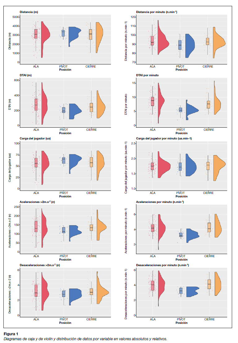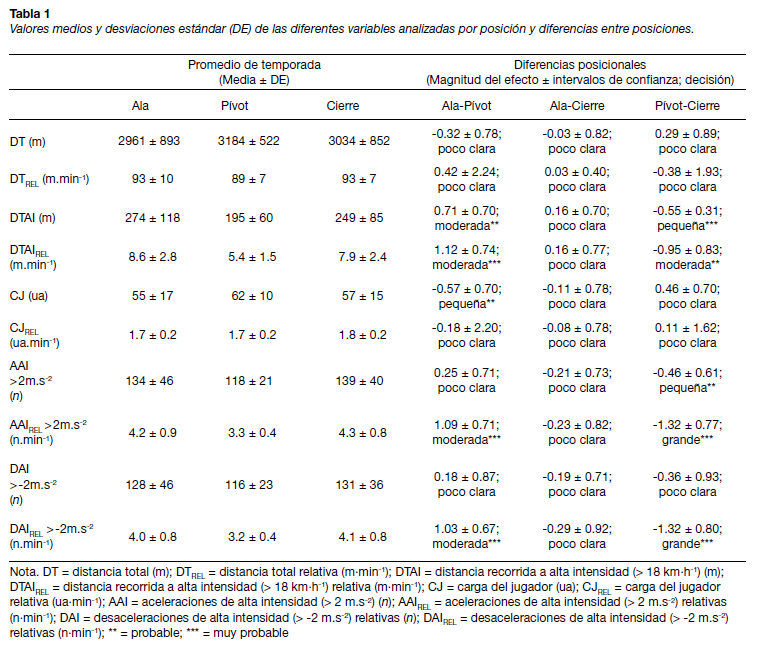 En la Tabla 1, se presentan los valores medios ± desviación estándar de cada una de las variables analizadas por cada posición específica del juego incluyendo la magnitud del efecto ± intervalos de confianza y la decisión para las diferencias posicionales.