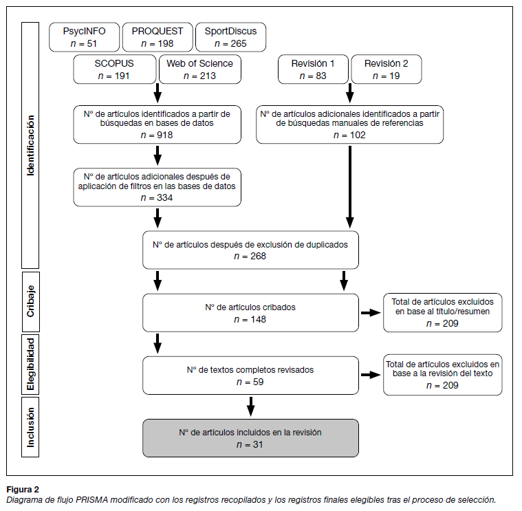Se realizó una búsqueda rigurosa de literatura en las bases de datos electrónicas siguientes: PsycInfo (APA); ProQuest (Physical Education Index); SportDiscus a través de EBSCO; Scopus (Elsevier), y Web of Science - Core Collection (Clarivate Analytics). Se optó por utilizar tales bases de datos por su inclusión de revisiones sistemáticas relacionadas con el apoyo social en el ámbito de las ciencias del deporte (Bremer, 2012; Sheridan et al., 2014), y se realizó una búsqueda secundaria manual en listas de referencia para localizar estudios adicionales.