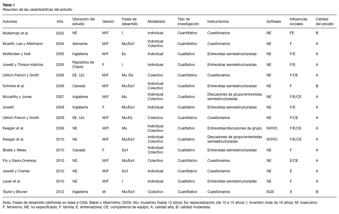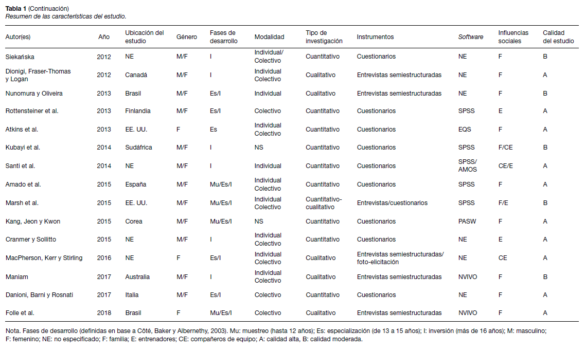 La mayoría de las investigaciones se llevaron a cabo con deportistas de ambos sexos (24) y solo una se realizó exclusivamente con deportistas de sexo masculino. En cuanto a la fase de desarrollo a largo plazo del deportista (Côté et al., 2003), 10 estudios se llevaron a cabo con deportistas en las tres fases (diversificación, especialización, inversión) y 14 estudios incluían a practicantes de deportes de equipo e individuales.