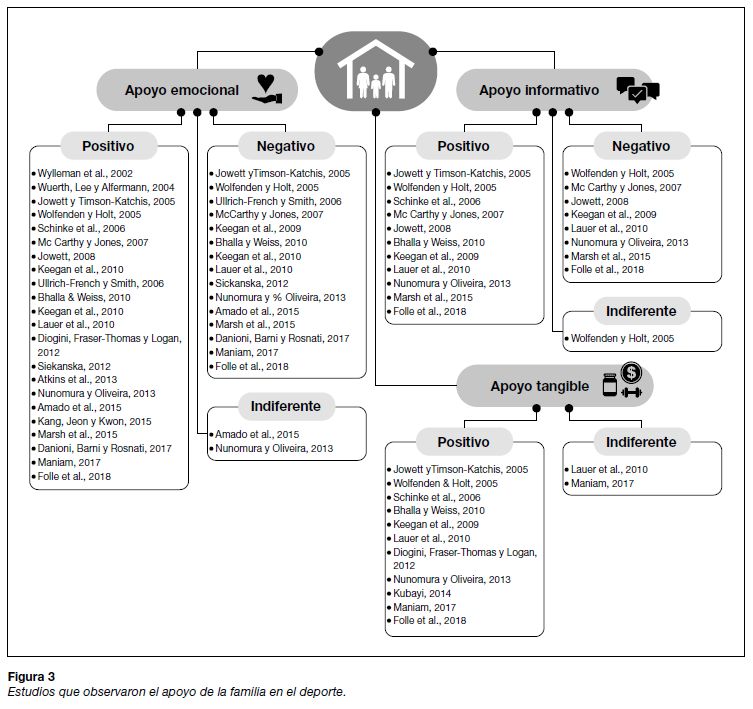 La información incluida relativa a la influencia de la familia se obtuvo de 24 estudios (Figura 3). En nuestro análisis detectamos que, según la percepción de los deportistas investigada en los estudios seleccionados, el apoyo que brindaba la familia era fundamentalmente emocional.