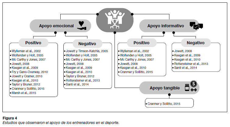 La información acerca de la influencia de los entrenadores se extrajo de los 14 estudios destacados en la Figura 4. En la percepción de los deportistas investigados, observamos que los entrenadores les daban apoyo principalmente a través de su respaldo emocional e informativo.