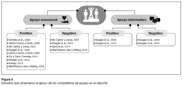 La información analizada con respecto a la influencia de los compañeros de equipo se extrajo de nueve estudios (Figura 5). Según la percepción de los deportistas, los compañeros de equipo proporcionaban principalmente apoyo emocional para la práctica deportiva.