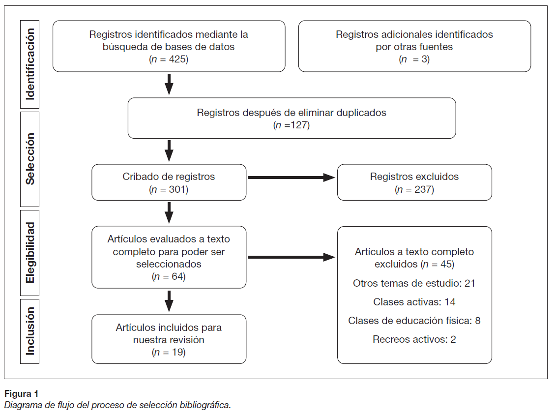 El proceso de obtención de la información que se recoge en este estudio se realizó mediante una revisión sistematizada en las bases de datos Web of Science, Scopus y PubMed. Las dos primeras fueron seleccionadas debido a que son las bases de datos multidisciplinares que presentan una mayor cantidad de artículos incluidos, y con respecto a la última, fue seleccionada debido a que es la base de datos más específica para artículos relacionados con la salud. La búsqueda se realizó siguiendo los pasos principales de PRISMA (Preferred Reporting Items for Systematic Reviews and Meta‐Analyses), incluyendo la estrategia PICO para la búsqueda de artículos en cada una de las bases de datos: participantes/participants (p. ej. primaria, estudiantes, niños), intervención/intervention (p. ej. programa, test), comparadores/comparators (p. ej. educación física, contexto deportivo), resultados/outcomes (p. ej. detección, selección). La estrategia de búsqueda utilizada para estas bases de datos quedó conformada de la siguiente forma: (cognitive OR attention OR “executive function*”) AND (“Primary School”) AND (“physical activity” OR “active breaks”). Posteriormente, se siguieron los cuatros pasos principales del método PRISMA: identificación, selección, elegibilidad e inclusión (Moher et al., 2009). Siguiendo esta estrategia, la cantidad de artículos encontrados fue un total de 425 (Web of Science-147; Scopus-205; PubMed-73), más otros tres artículos que se incluyeron desde fuentes externas, lo que hizo un total de 428 artículos para nuestra revisión bibliográfica.